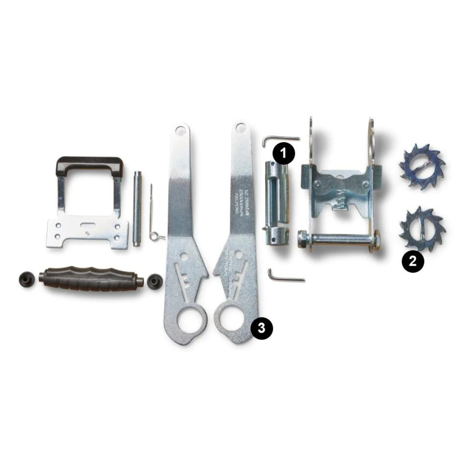 We hebben een eenvoudig idee verwerkt in de bestaande ratel. Wat we deden was het smeden van een nieuw op maat ontworpen hooggelegeerde en geharde halfopen ratelas (1), het versterken van de ratelwielen (2) en de handgreephendels (3)